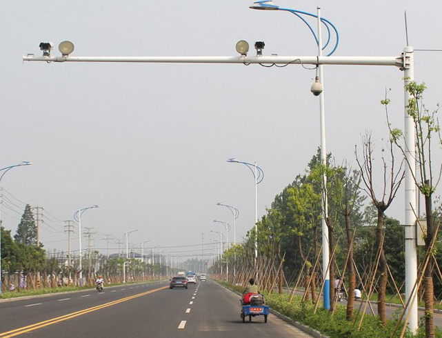 立桿要求攝像機離地面高度一般不低于5米,挑臂長度3~5米,立桿下端管徑應在220 mm±10mm、上端管徑應在120 mm±5mm,管壁厚度應≥6mm,表面防腐、抗臺風。立桿基礎深度不低于1.5米,基礎直徑大于1米,采用混凝土灌筑,以確保立桿的牢固度。