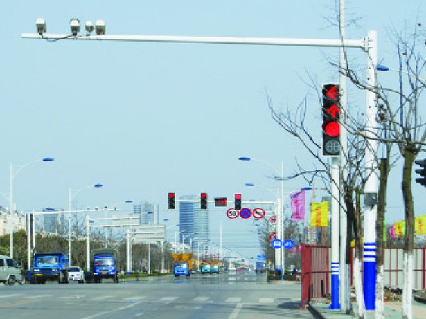 道路監(jiān)控桿也稱監(jiān)控桿與監(jiān)控立桿,立桿要求攝像機離地面高度一般不低于5米,挑臂長度3~5米,立桿下端管徑應在220 mm±10mm、上端管徑應在120 mm±5mm,管壁厚度應≥6mm,表面防腐、抗臺風。立桿基礎深度不低于1.5米,基礎直徑大于1米,采用混凝土灌筑,以確保立桿的牢固度。